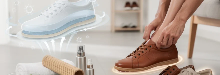 Une fois les pieds pris en charge, reste à traiter le second acteur de ce duo : la chaussure elle-même. Même avec une hygiène plantaire irréprochable, une paire déjà saturée de bactéries et de composés odorants continuera à dégager des effluves désagréables. La première règle consiste à instaurer un rythme de rotation : éviter de porter la même paire deux jours de suite laisse le temps à l’humidité interne de s’évaporer et aux matériaux de « respirer ».